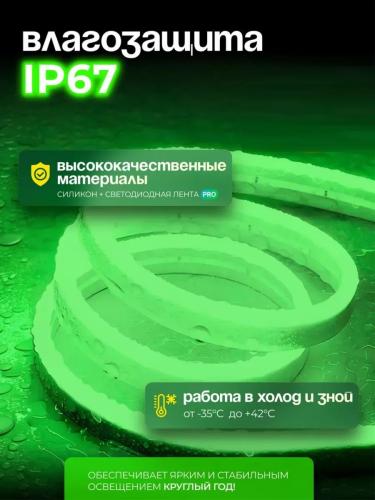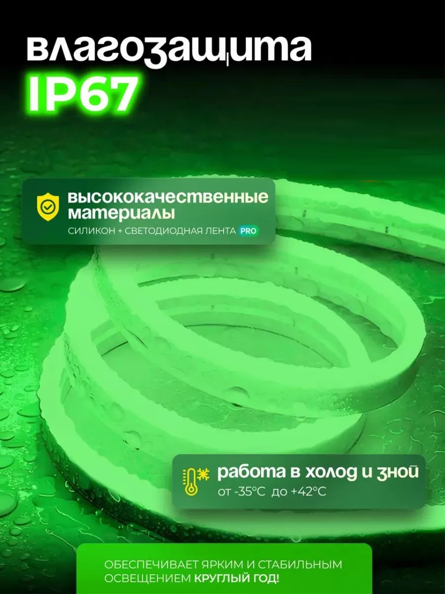 Гибкий неон 8x16мм рез.10см 220V AC SMD2835 120led/m Зеленый LUX выполненный из высококачественного силикона и led ленты серии PRO обеспечивает яркое равномерное свечение плотностью диодов 120шт на метр. Благодаря материалам исполнения, неон отлично зарекомендовал себя при работе в экстремальных погодных условиях при температуре от -35 до +42, степень влагозащиты IP67 обеспечивает стабильную работу как в дождь, так и слякоть.