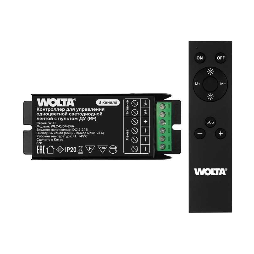 Контроллер 3-канальный Wolta WLC-C/04-24А 12-24В для одноцветной ленты, 24А с пультом RF предназначен для включения и включения светодиодной ленты, управления режимами, регулировкой яркости свечения (диммирования). Контроллер имеет встроенную функцию запоминания последнего режима работы после включения - управляется при помощи пульта RF, радиусом действия до 15м. Размер пульта 150х40х13мм, частота работы 443МГц.